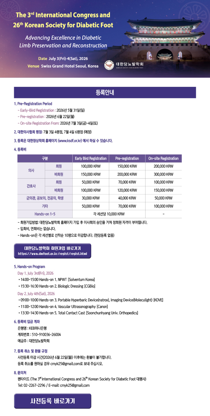 | Á¦¸ñ | The 3rd International Congress and 26th Korean Society for Diabetic Foot | |